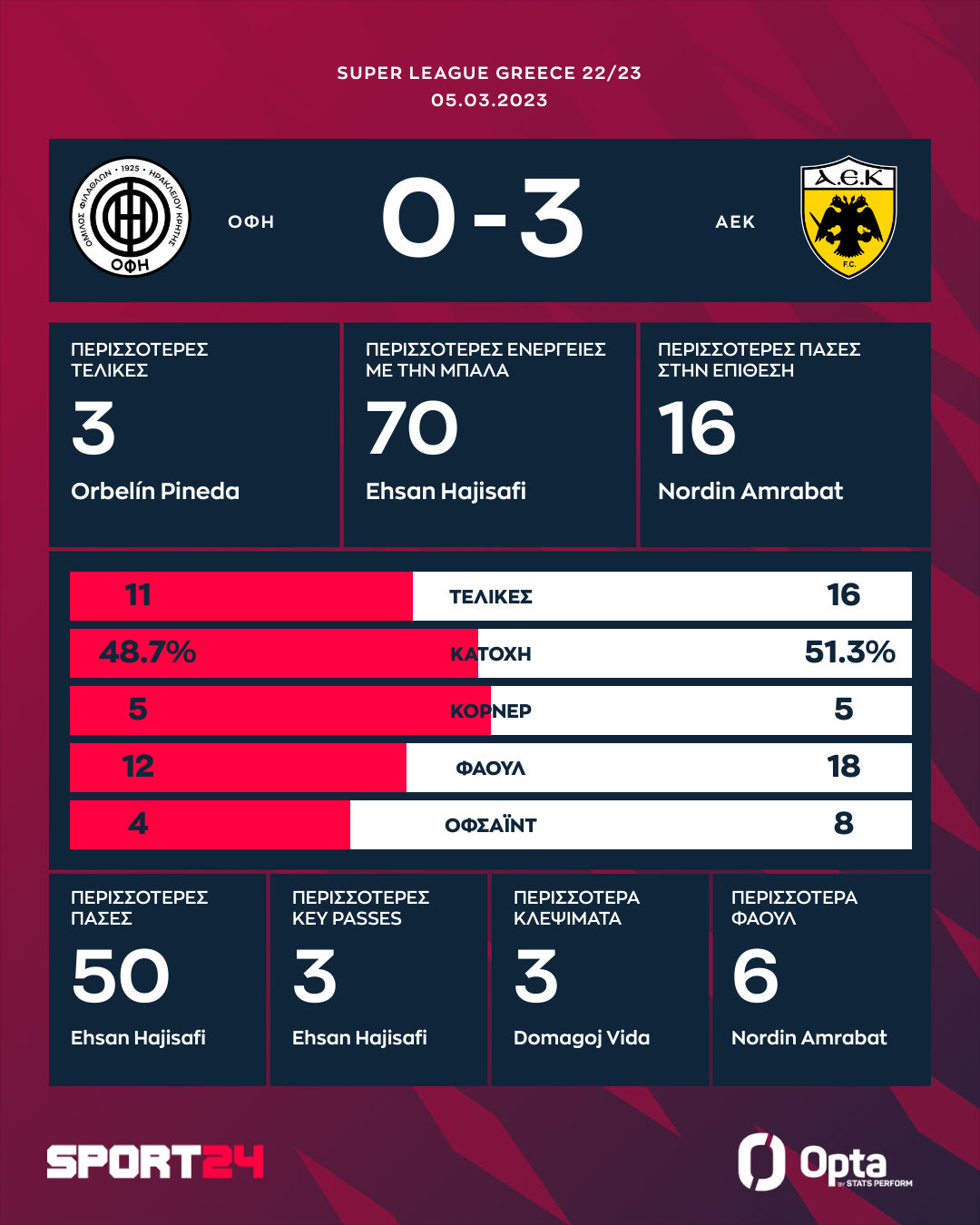 Η ΑΕΚ έκανε μία κυριαρχική εμφάνιση στο Ηράκλειο, επικράτησε 3-0 του ΟΦΗ στο Γεντί Κουλέ και πέρασε στην κορυφή της Stoiximan Super League. Αυτογκόλ ο Πασαλίδης (43') και γκολ οι Άμραμπατ (49'), Γκατσίνοβιτς (62').