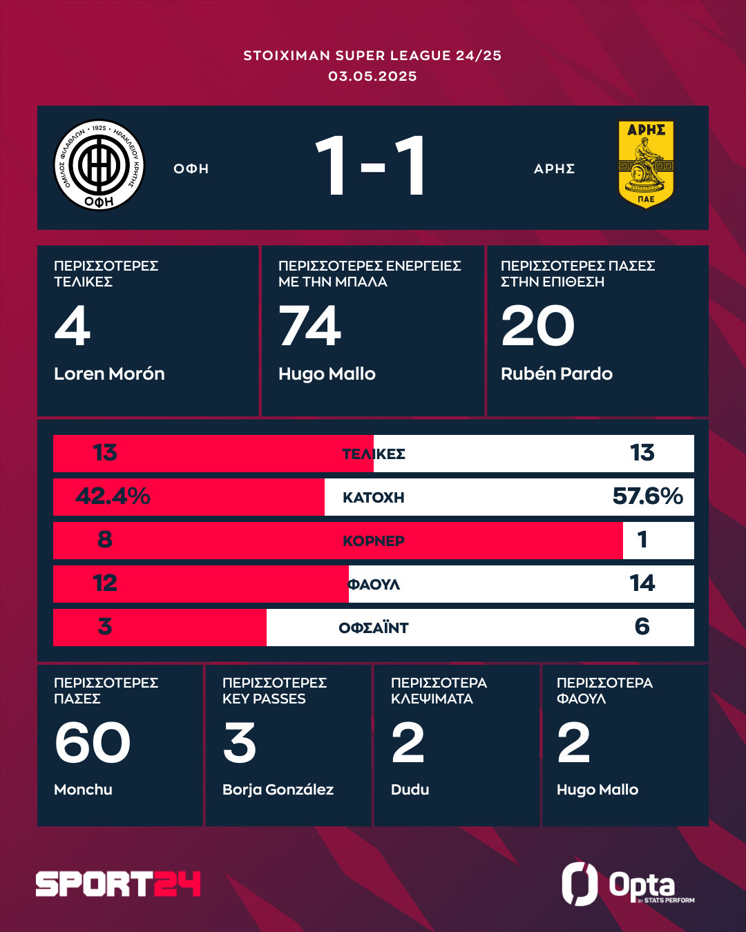 Η αναμέτρηση στο Ηράκλειο μεταξύ του ΟΦΗ και του Άρη για την 5η αγωνιστική των playoffs στις θέσεις 5-8 δεν είχε νικητή καθώς ολοκληρώθηκε με σκορ 1-1, έβγαλε ωστόσο έναν μεγάλο κερδισμένο.