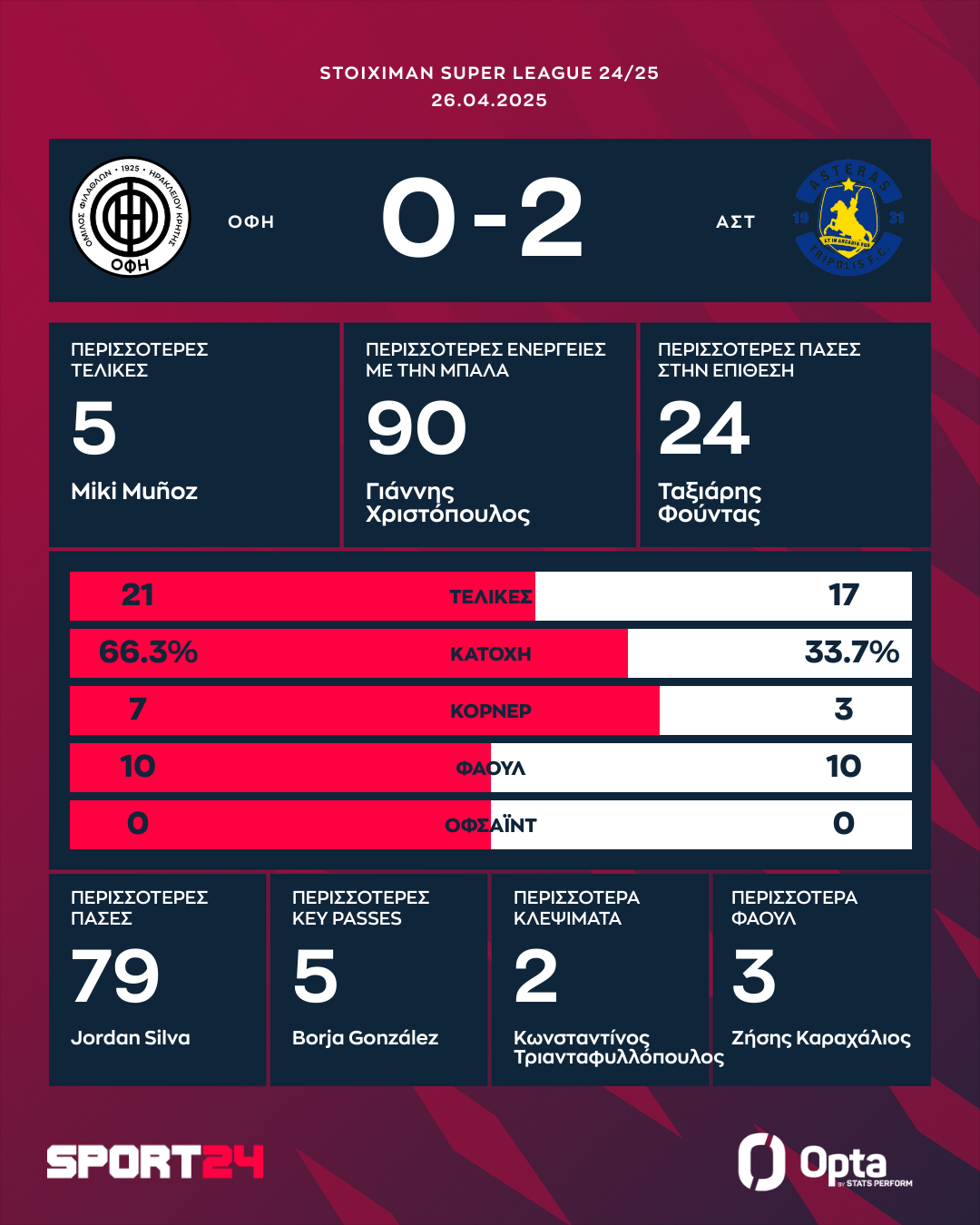 Ο ΟΦΗ έφτασε ξανά μια ανάσα από το γκολ, με τον Θεοδοσουλάκη να έχει και δεύτερο δοκάρι στο 41′. Ο Φούντας έβγαλε τη σέντρα από δεξιά και ο νεαρός φορ πήρε την κεφαλιά, αλλά η μπάλα σταμάτησε στο δεξί δοκάρι των “Αρκάδων”. Ο ΟΦΗ έκλεισε το πρώτο μέρος με 11 τελικές και 1.4 xGoals, όμως δεν μπόρεσε να παραβιάσει την εστία του Αστέρα AKTOR.