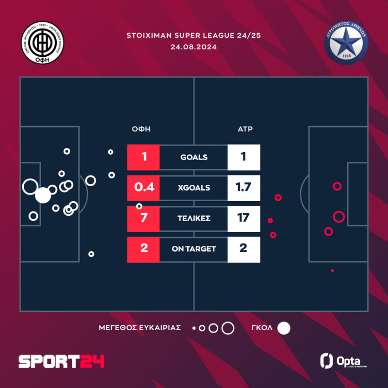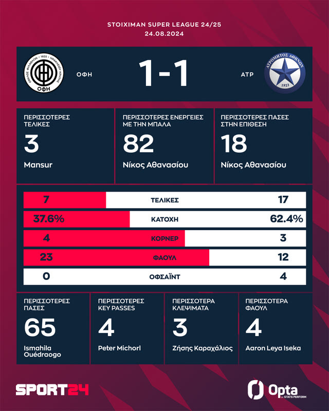 Ο Ατρόμητος πήρε άξιο βαθμό στο Ηράκλειο ισοφαρίζοντας σε 1-1 τον ΟΦΗ στις καθυστερήσεις με τον Καλοσκάμη έπειτα από γρήγορη εκτέλεση πλαγίου από τον Αθανασίου. Ο Γκονζάλες είχε ανοίξει το σκορ για τους γηπεδούχους στο πρώτο μέρος.