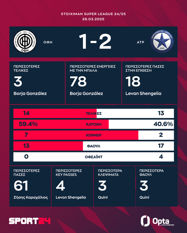 Με το δεξί μπήκε στα Playoffs 5-8 της Stoiximan Super League ο Ατρόμητος. Η ομάδα του Πάμπλο Γκαρσία νίκησε με 2-1 τον ΟΦΗ στο “Θ. Βαρδινογιάννης” για την πρώτη αγωνιστική και έπιασε τον Άρη στην πρώτη θέση με 21 βαθμούς, με τους “κίτρινους” όμως να υπερέχουν στην ισοβαθμία.