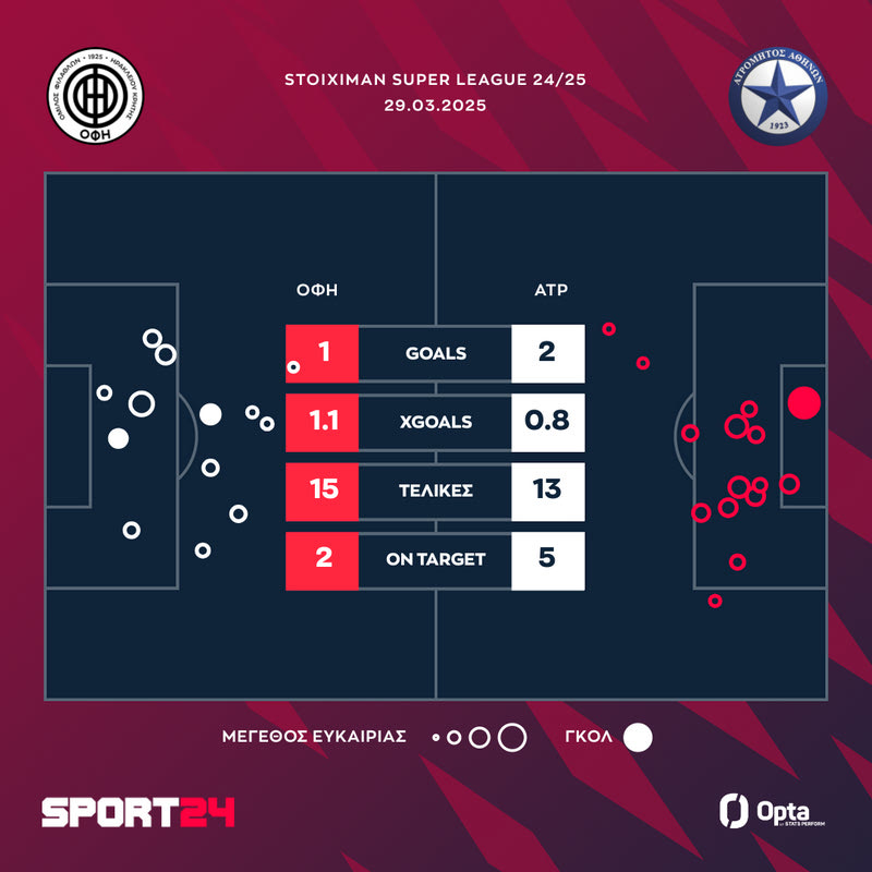 Στο φινάλε του πρώτου μέρους ο ΟΦΗ άγγιξε το 2-1, όταν ο Σενγκέλια γύρισε από δεξιά στον Γκονζάλες που σούταρε με τη μία με το δεξί, αλλά η μπάλα τράνταξε το αριστερό δοκάρι του Χουτεσιώτη.