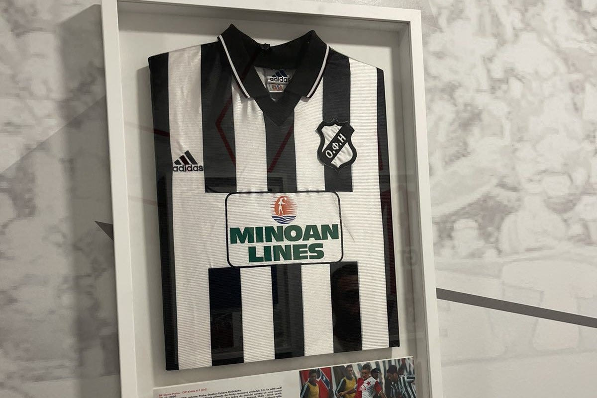 Η φανέλα του ΟΦΗ βρίσκεται στο εσωτερικό του γηπέδου της Σλάβια Πράγας, Φορτούνα Αρίνα. Οι δύο ομάδες είχαν αναμετρηθεί στο παρελθόν για το Κύπελλο UEFA.