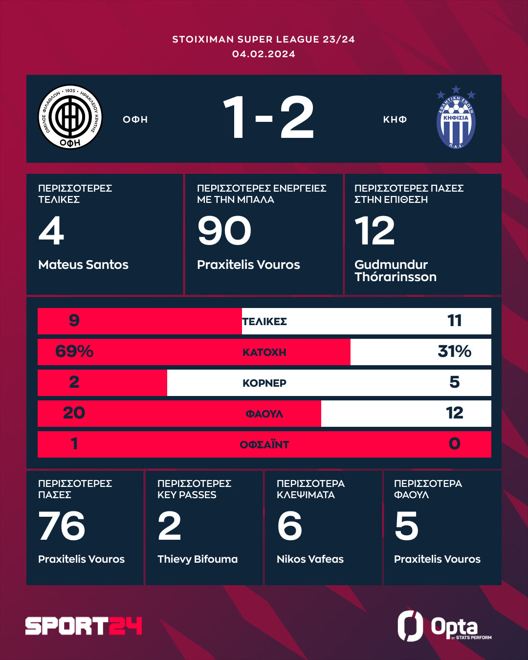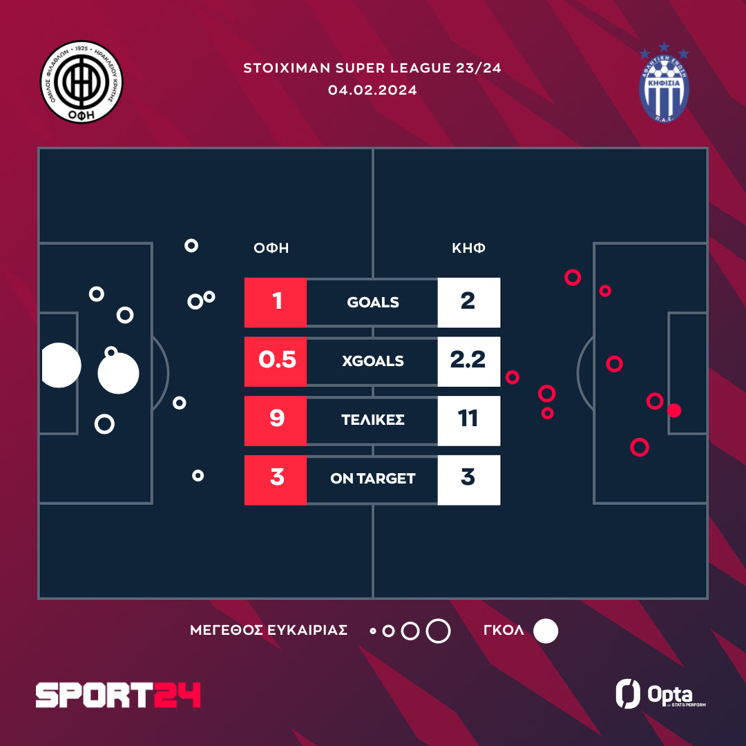 Η Κηφισιά πανηγύρισε σπουδαίο διπλό στο Ηράκλειο, επικρατώντας 2-1 του ΟΦΗ παίρνοντας την πρώτη της νίκη για το 2024. Δύο γκολ πέτυχε ο Οζέγκοβιτς (10', 64'), μείωσε ο Αποστολάκης στο 71'.