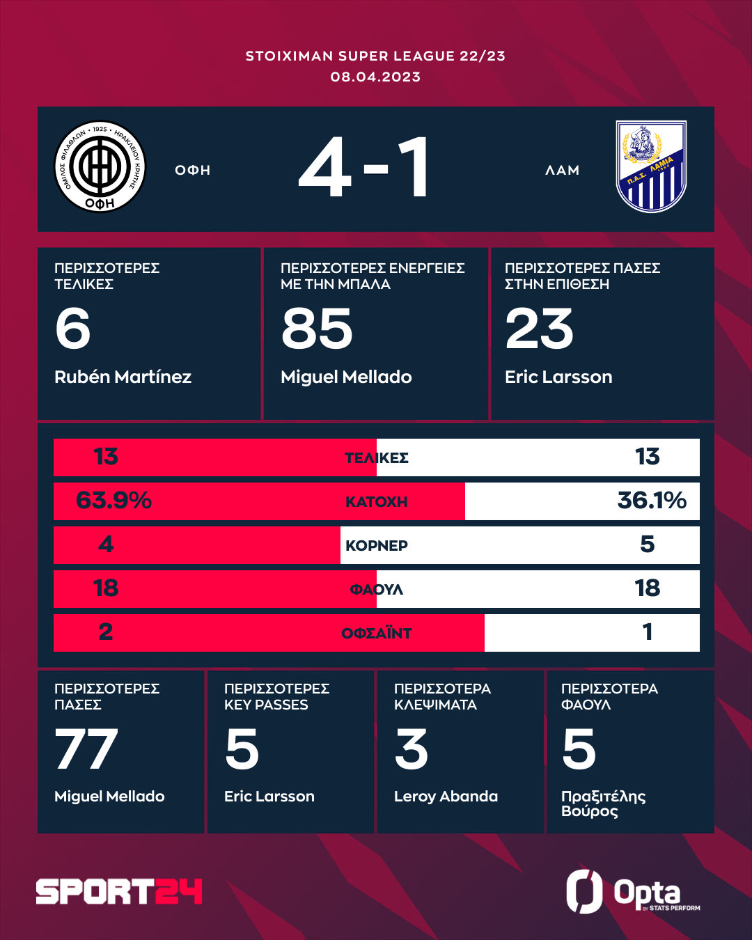ΟΦΗ – Λαμία 4-1: Κρητική τεσσάρα με ανατροπή, παραμένουν σε δύσκολη θέση οι Φθιώτες