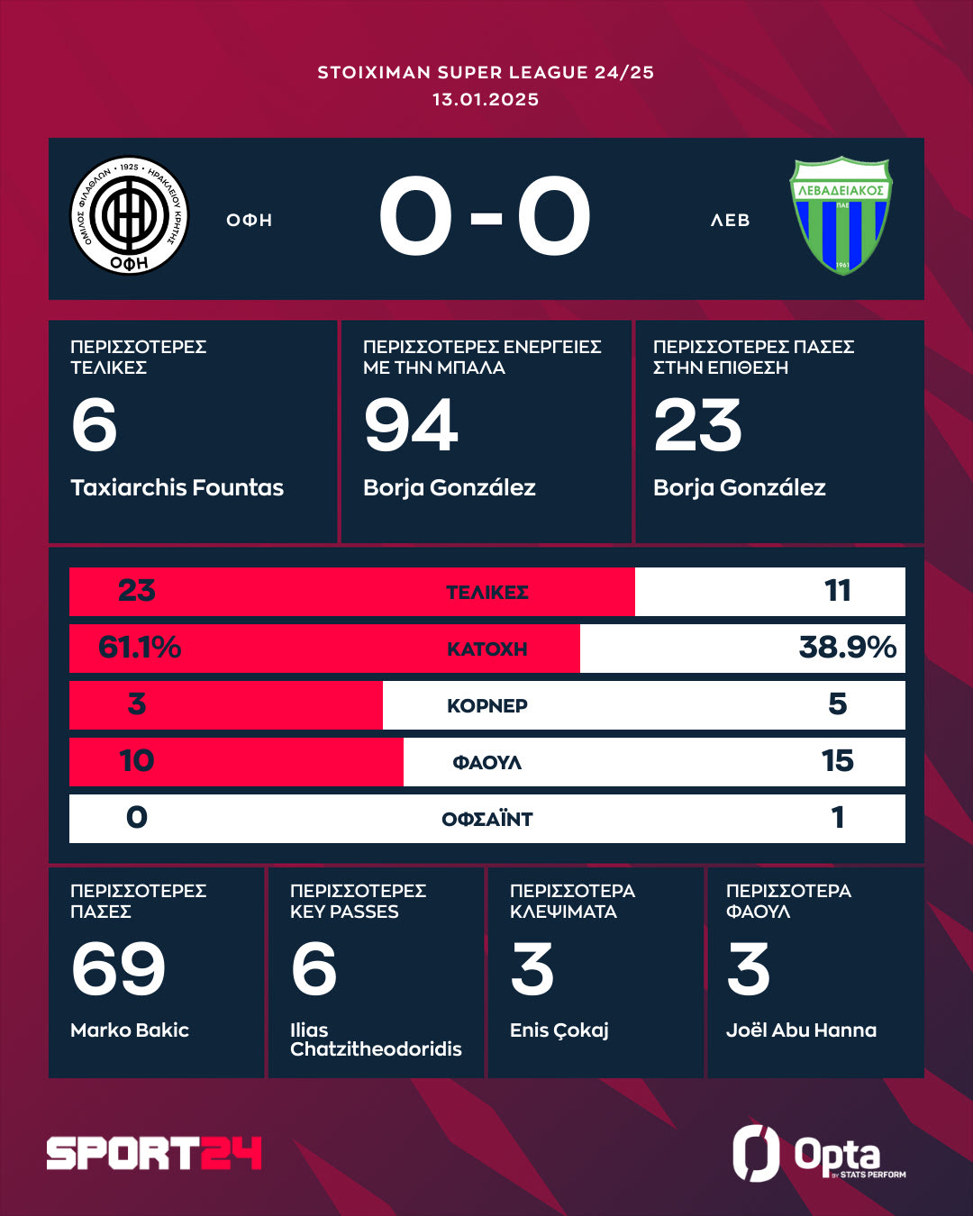 ΟΦΗ και Λεβαδειακός έμειναν στο 0-0 στο Γεντί Κουλέ για τη 18η αγωνιστική της Stoiximan Super League, σ' ένα ματς με τρία δοκάρια, πολλές ευκαιρίες και 31 τελικές.