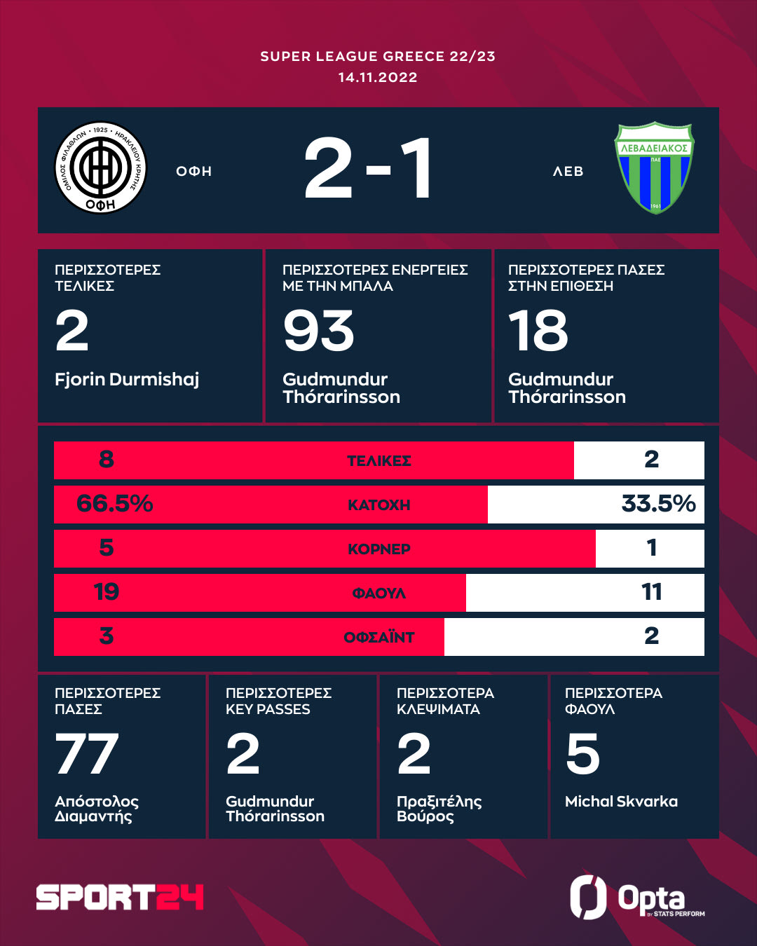 Ο ΟΦΗ έκανε την ανατροπή απέναντι στον Λεβαδειακό, πήρε τη νίκη με 2-1 και "ανάσανε" με το τρίποντο. Οι Βοιωτοί με αυτογκόλ του Ντουρμισάι (1') προηγήθηκαν, όμως Νέιρα (74') και Ντουρμισάι (82') έφεραν το ματς τούμπα.