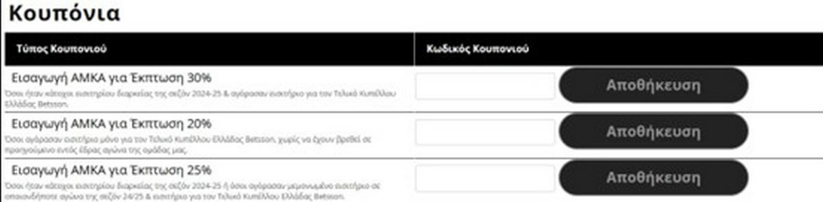 -20%: Για όσους αγόρασαν εισιτήριο για τον Τελικό Κυπέλλου Ελλάδας Betsson 2025 και δεν προμηθεύτηκαν κανένα μεμονωμένο εισιτήριο τη σεζόν 2024-25.