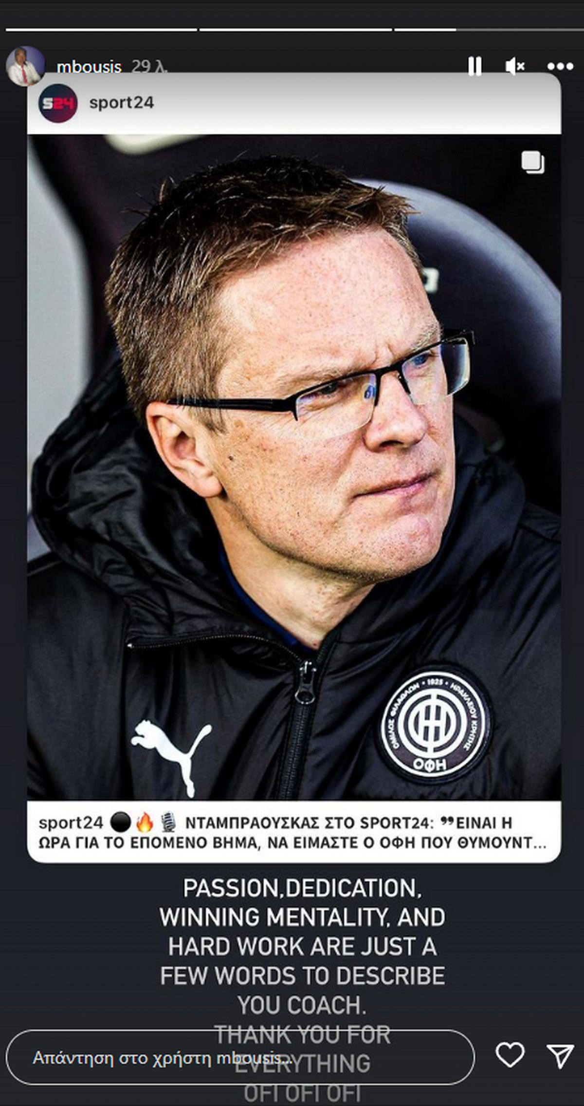 Ο Μιχάλης Μπούσης ανταπέδωσε από την πλευρά του. Σε story του στο Instagram δημοσίευσε τη συνέντευξη του Νταμπράουσκας στο SPORT24 και έγραψε: “Πάθος, αφοσίωση, νοοτροπία νίκης και σκληρή δουλειά είναι λίγες λέξεις για να σε περιγράψουν κόουτς. Σε ευχαριστώ για όλα”.
