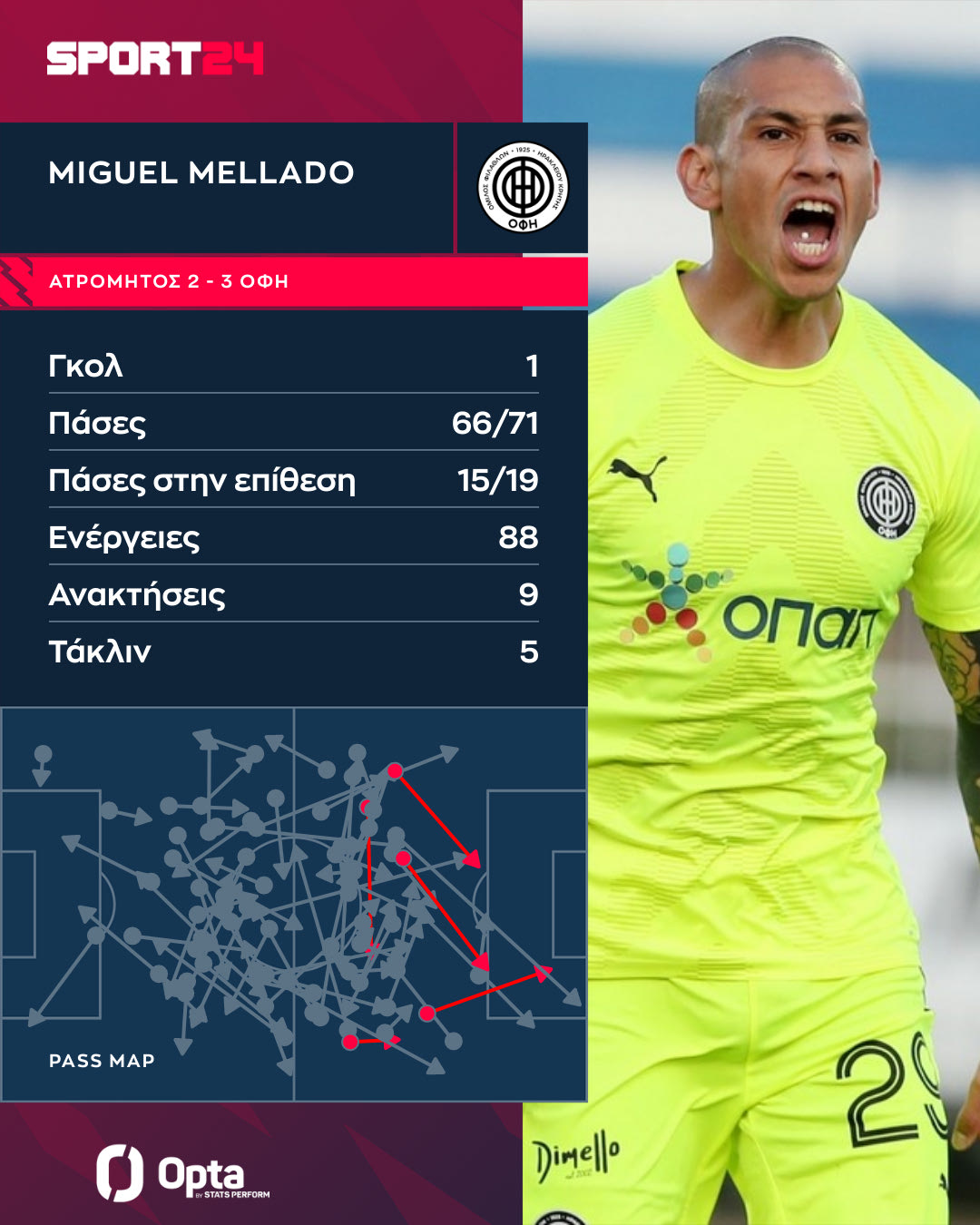 Στο γράφημα της Opta/Stats Perform μπορείτε να δείτε τις μεταβιβάσεις, αλλά και τις κορυφαίες επιδόσεις του Μεγιάδο στην αναμέτρηση με τον Ατρόμητο.