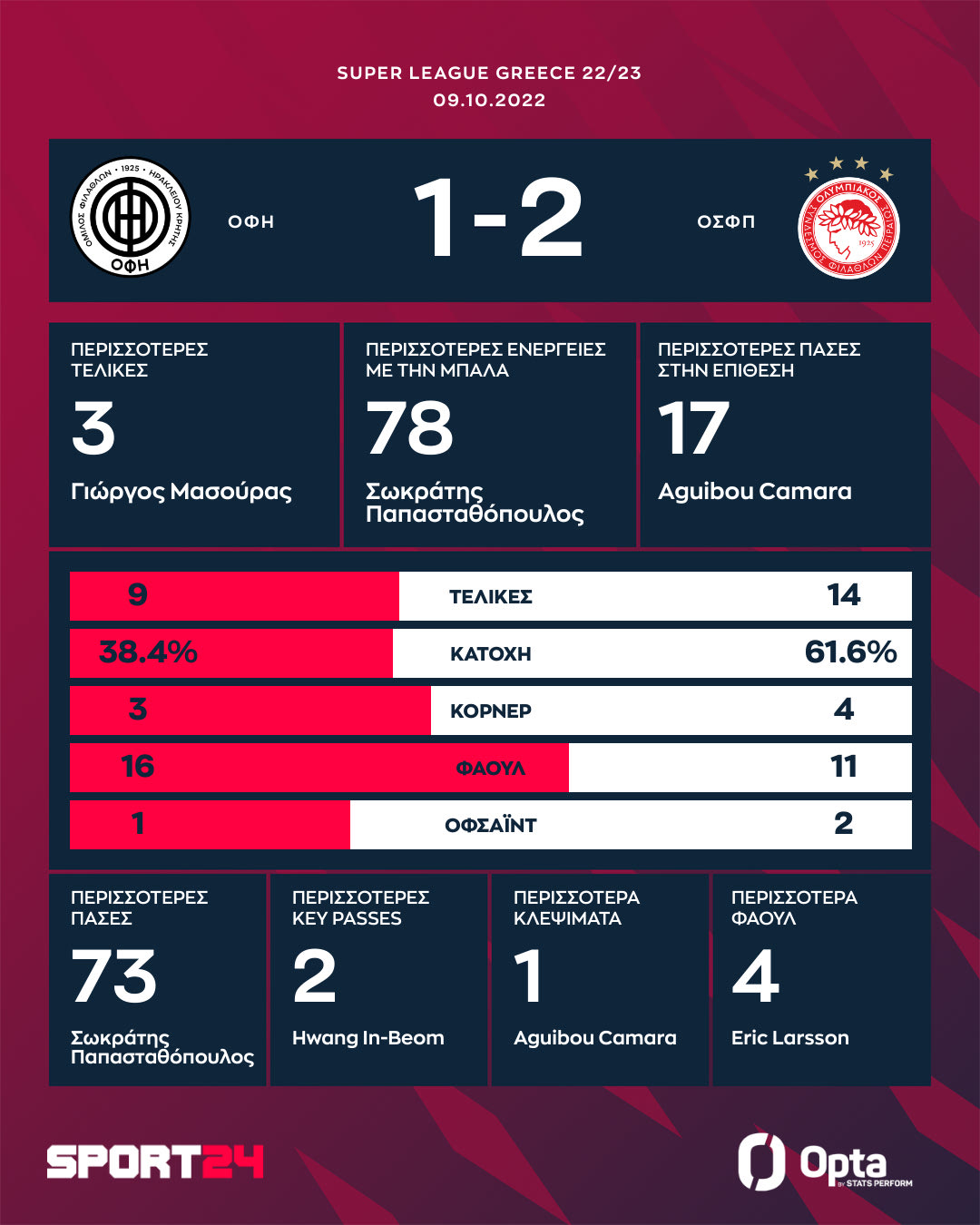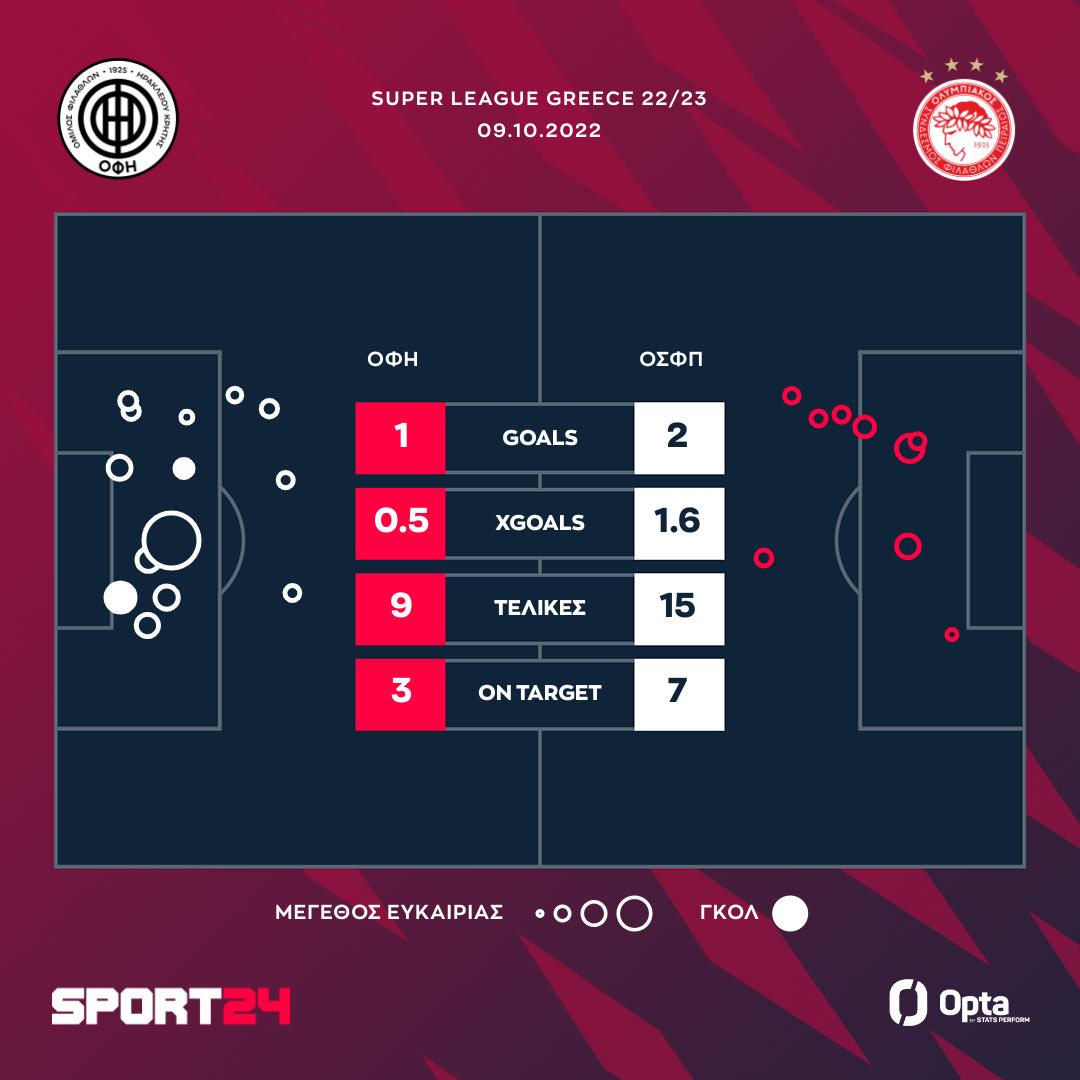Ο Ολυμπιακός πήρε μία μεγάλη νίκη στο Ηράκλειο επικρατώντας 2-1 του ΟΦΗ για την 7η αγωνιστική. Οι Κρητικοί προηγήθηκαν στο πρώτο μέρος, αλλά Γκάρι Ροντρίγκες (58') και Μπακαμπού (81') έφεραν το ματς "τούμπα".