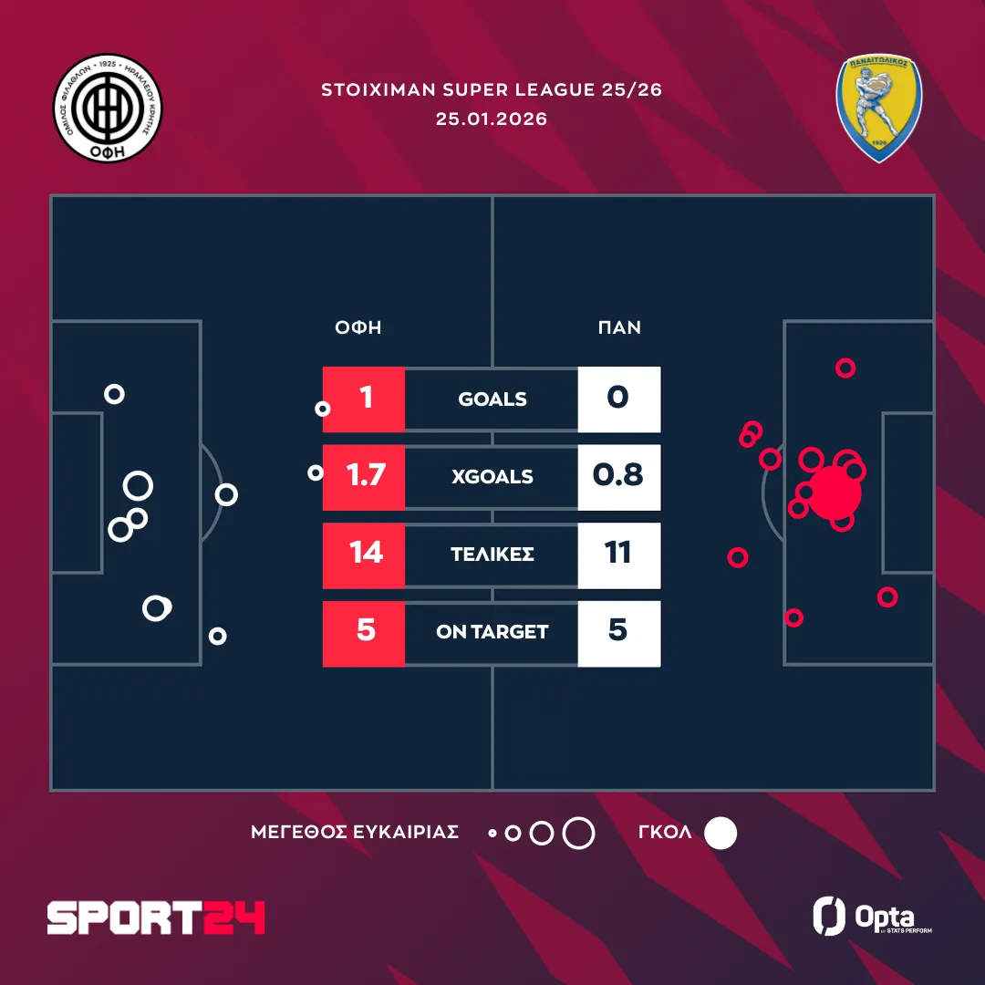 Το νικητήριο γκολ πέτυχε ο Σαλσίδο στο 40ο λεπτό της αναμέτρησης με εύστοχη εκτέλεση πέναλτι, το οποίο μάλιστα κέρδισε ο ίδιος. Κάπως έτσι, ο ΟΦΗ κεφαλαιοποίησε την υπεροχή, που είχε στο μεγαλύτερο κομμάτι του παιχνιδιού, ενώ άντεξαν στο φινάλε, όταν και οι φιλοξενούμενοι επιχείρησαν να πιέσουν. Οι Αγρινιώτες τελείωσαν το ματς με δέκα παίκτες, εξαιτίας αποβολής του Σατσιά στο 90+5′.
