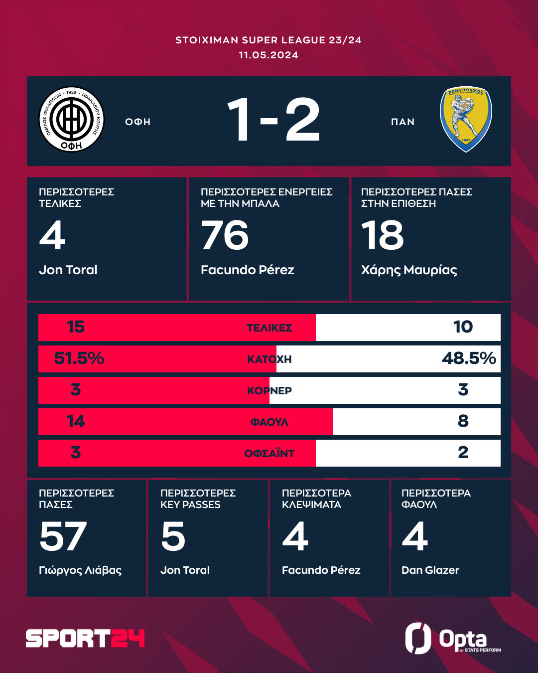 Το μόνο που κατάφερε ο ΟΦΗ ήταν να μειώσει το σκορ στο 65′ όταν σε υπέροχη πάσα του Τοράλ ο Αποστολάκης έγινε κάτοχος της μπάλας, μπήκε στην περιοχή και πλάσαρε για το 1-2.