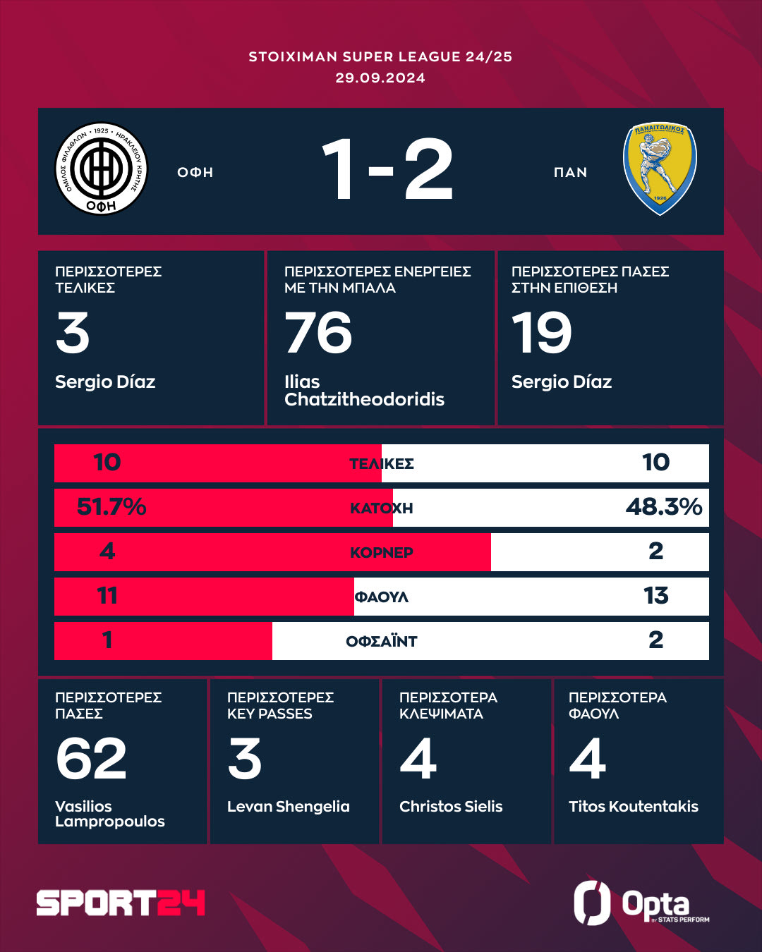 Στο 82′ μάλιστα, ο ΟΦΗ έκανε ένα τεράστιο δώρο στον Παναιτωλικό, που με το αυτογκόλ του Χριστόπουλου έκανε το 1-2. Ο Χριστόπουλος άπλωσε το πόδι του στο σουτ του Μπελεβώνη κι έτσι, έστειλε την μπάλα στην εστία της ομάδας του.