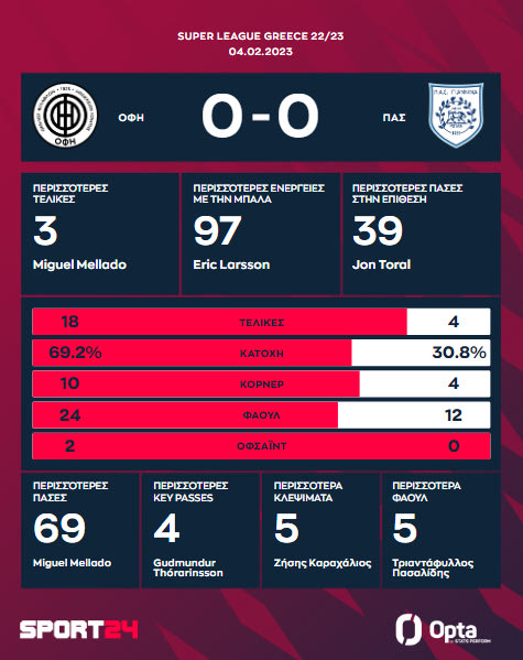 Ο ΟΦΗ βρήκε το γκολ που πέτυχε στο 90+6′ με τον Φελίπε, αλλά ακυρώθηκε για οφσάιντ μέσω VAR, με τις δύο ομάδες να παίρνουν τον βαθμό της ισοπαλίας. Ο ΠΑΣ έπαιξε στο φινάλε με δέκα παίκτες, καθώς ο Παντελάκης αποβλήθηκε με δεύτερη κίτρινη κάρτα για καθυστέρηση στο 90+4′, προκαλώντας έξαλλες διαμαρτυρίες των φιλοξενούμενων.