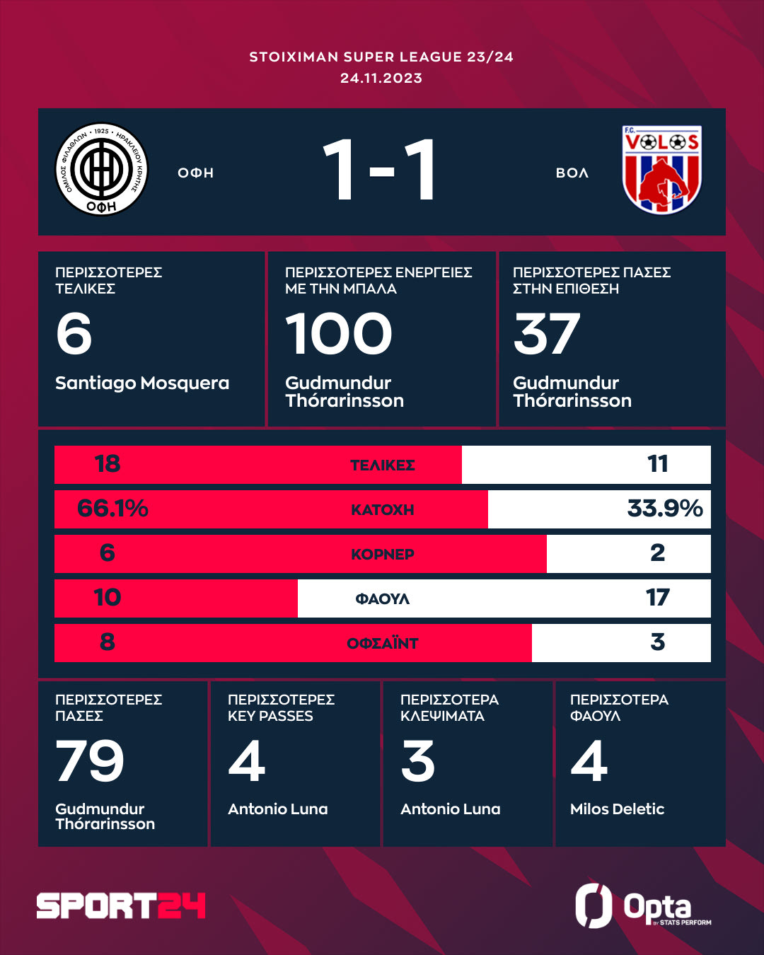 Στο παιχνίδι στο οποίο μπήκαν έξι γκολ και μέτρησαν τα δύο ο Βόλος κατάφερε να πάρει έναν σημαντικό βαθμό, όπως εξελίχθηκε το ματς, στο ντεμπούτο του Άνχελ Λόπεθ στον πάγκο της ομάδα;ς της Μαγνησίας ενώ ο ΟΦΗ για πέμπτο σερί παιχνίδι, τρίτο στην έδρα του έμεινε μακριά από τη νίκη με αποτέλεσμα να υπάρξει μουρμούρα, εκνευρισμός και αποδοκιμασίες κατά την αποχώρηση των ποδοσφαιριστών του από τον κόσμο.
