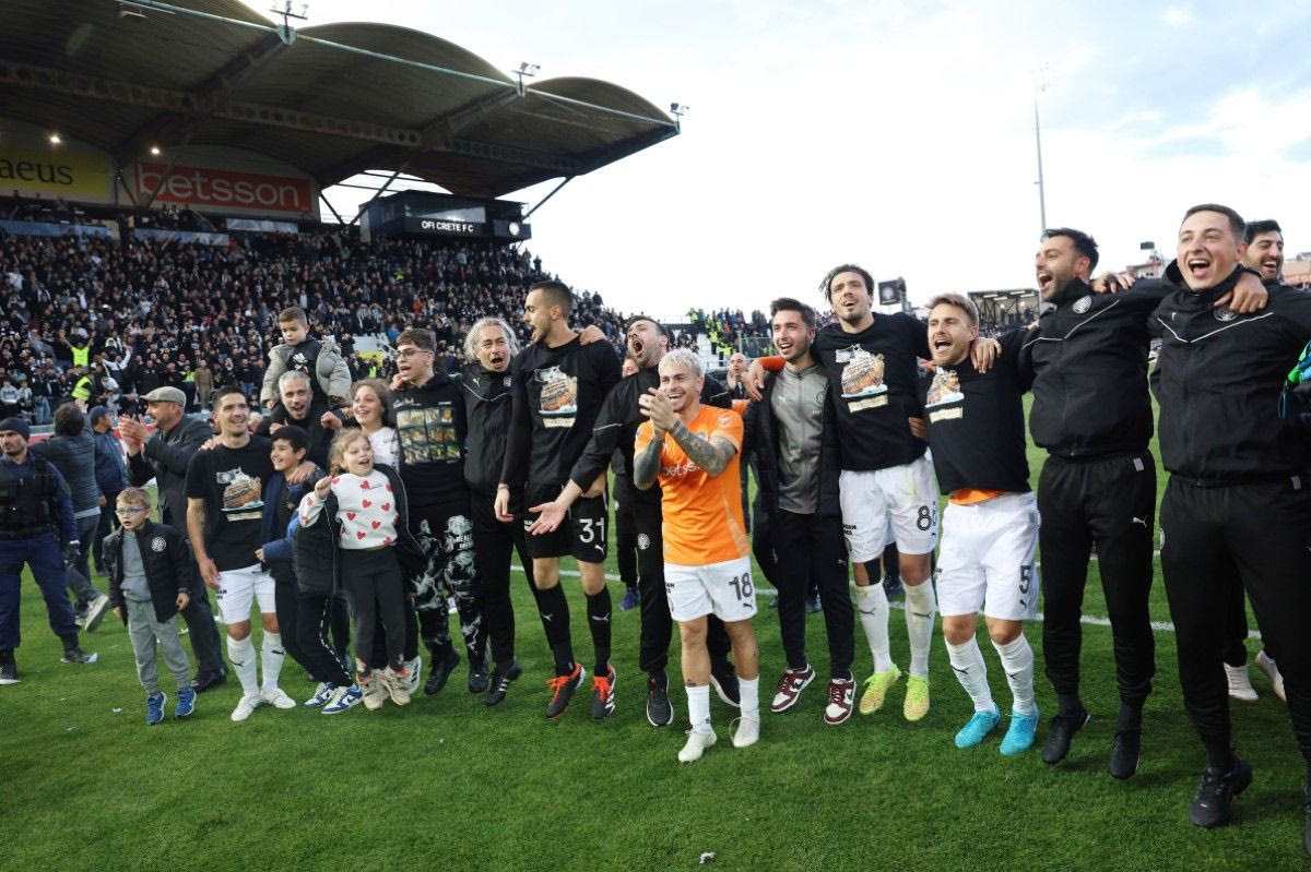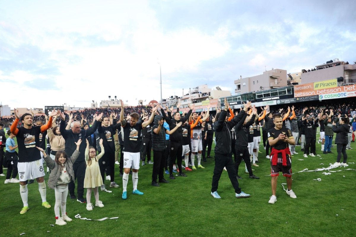 Ξέφρενοι πανηγυρισμοί από τους παίκτες του ΟΦΗ και τις οικογένειές τους, μετά την πρόκριση της ομάδας τους στον τελικό του Κυπέλλου Ελλάδας Betsson.