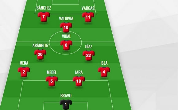 GROUP AΧΙΛΗΤερματοφύλακες 1. Κλαούντιο Μπράβο (32) Μπαρτσελόνα 12. Πάουλο Καρσές (30) Κόλο-Κόλο 23. Χόνι Ερέρα (34) Ουνιβερσιδάδ ντε Τσίλε Αμυντικοί 2. Εουχένιο Μένα (26) Κρουζέιρο 3. Μίκο Αλμπορνός (24) Ανόβερο 4. Μαουρίσιο Ίσλα (26) Γιουβέντους / ΚΠΡ 13. Χοσέ Ρόχας (32) Ουνιβερσιδάδ ντε Τσίλε 17. Γκάρι Μεδέλ (27) Ίντερ 18. Γκονσάλο Χάρα (29) Μάιντς Μέσοι 5. Φρανσίσκο Σίλβα (29) Μπριζ 6. Νταβίντ Πισάρο (35) Φιορεντίνα 8. Αρτούρο Βιδάλ (28) Γιουβέντους 10. Χόρχε Βαλδίβια (31) Παλμέιρας 14. Ματίας Φερνάντες (29) Φιορεντίνα 15. Ζαν Μποσεζούρ (31) Κόλο-Κόλο 16. Φελίπε Γκουτιέρες (24) Τβέντε 19. Χοσέ Πέδρο Φουενσαλίδα (30) Μπόκα Τζούνιορς 20. Τσάρλες Αράνγκις (26) Ιντερνασιονάλ 21. Μαρσέλο Ντίας (28) Αμβούργο Επιθετικοί 7. Αλέξις Σάντσες (26) Άρσεναλ 9. Μαουρίσιο Πινίγια (31) Αταλάντα 11. Εντουάρντο Βάργκας (25) Νάπολι / ΚΠΡ 22. Άνχελο Ενρίκες (21) ManUtd / Ντίναμο Ζάγκρεμπ ΠΡΟΠΟΝΗΤΗΣ: Χόρχε Σαμπαόλι (Αργεντινή) |