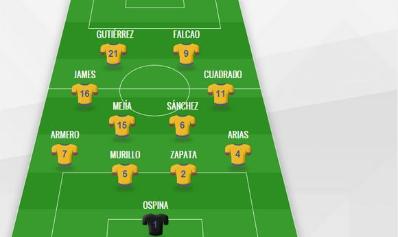 ΚΟΛΟΜΒΙΑΤερματοφύλακες 1. Νταβίντ Οσπίνα (26) Άρσεναλ 12. Καμίλο Βάργκας (25) Ατλέτικο Νασιονάλ 23. Κριστιάν Μπονίγια (22) Λα Εκιδάδ Αμυντικοί 2. Κριστιάν Σαπάτα (28) Μίλαν 3. Πέδρο Φράνκο (24) Μπεσίκτας 4. Σαντιάγο Άριας (23) Αϊντχόφεν 7. Πάμπλο Αρμέρο (28) Φλαμένγκο 13. Ντάρουιν Αντράντε (24) Σταντάρ Λιέγης 14. Κάρλος Βαλντές (30) Νασιονάλ 18. Καμίλο Σούνιγα (29) Νάπολι 22. Χέισον Μουρίγιο (23) Γρανάδα Μέσοι 5. Έντουιν Βαλένσια (30) Σάντος 6. Κάρλος Σάντσες (29) Άστον Βίλα 8. Έντουιν Καρδόνα (22) Μοντερέι 10. Χάμες Ροντρίγκες (23) Ρεάλ 11. Χουάν Κουαδράδο (27) Τσέλσι 15. Αλεσάντερ Μεχία (26) Μοντερέι Επιθετικοί 9. Ρανταμέλ Φαλκάο (29) ManUtd / Μονακό 16. Βίκτορ Ιμπάρμπο (25) Ρόμα 17. Κάρλος Μπάκα (28) Σεβίλλη 19. Τεόφιλο Γκουτιέρες (30) Ρίβερ Πλέιτ 20. Λουίς Μουριέλ (24) Σαμπντόρια 21. Τζάκσον Μαρτίνες (28) Πόρτο ΠΡΟΠΟΝΗΤΗΣ: Χοσέ Πέκερμαν (Αργεντινή) |
