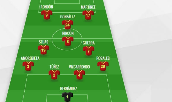 ΒΕΝΕΖΟΥΕΛΑΤερματοφύλακες 1. Αλάιν Μπαρόχα (25) Καράκας 12. Ντάνι Ερνάντες (29) Τενερίφη 23. Ουιλκέρ Φαρίνιες (17) Καράκας Αμυντικοί 2. Ουιλκέρ Άνχελ (22) Ντεπορτίβο Τάτσιρα 3. Αντρές Τούνιες (28) Μπουριράμ Γιουνάιτεντ 4. Οσουάλδο Βισκαρόντο (31) Ναντ 5. Φερνάντο Αμορεμπιέτα (30) Μίντλεσμπρο 6. Γκαμπριέλ Σιτσέρο (31) Μινέρος ντε Γκουαγιάνα 16. Ρομπέρτο Ροσάλες (26) Μάλαγα 20. Γκρέντι Περόσο (29) Αζαξιό Μέσοι 8. Τομάς Ρινκόν (27) Τζένοα 10. Ρόναλντ Βάργκας (28) Μπαλικέσισπορ 11. Σέσαρ Γκονσάλες (32) Ντεπορτίβο Τάτσιρα 13. Λουίς Μανουέλ Σέιχας (28) Σάντα Φε 14. Φράνκλιν Λουσένα (34) Ντεπορτίβο Λα Γκουάιρα 15. Αλεχάντρο Γκέρα (29) Ατλέτικο Νασιονάλ 18. Χουάν Αράνγκο (35) Τιχουάνα 19. Ραφαέλ Ακόστα (26) Μινέρος ντε Γκουαγιάνα 22. Χον Μουρίγιο (20) Σαμόρα / Μπενφίκα Επιθετικοί 7. Μίκου (29) Ράγιο Βαγιεκάνο 9. Σαλομόν Ροντόν (25) Ζενίτ 17. Χοσέφ Μαρτίνες (22) Τορίνο 21. Χέλμιν Ρίβας (26) Ντεπορτίβο Τάτσιρα ΠΡΟΠΟΝΗΤΗΣ: Νοέλ Σανβισέντε (Βενεζουέλα) |