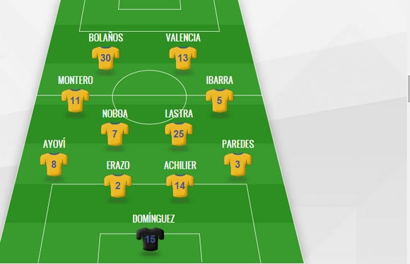 ΕΚΟΥΑΔΟΡΤερματοφύλακες 1. Λιμπράδο Ασκόνα (31) Ιντεπεντιέντε ντε Βάλε 12. Εστέμπαν Ντριρ (33) Εμελέκ 23. Αλεσάντερ Ντομίνγκες (28) Λίγκα ντε Κίτο Αμυντικοί 2. Αρτούρο Μίνα (24) Ιντεπεντιέντε ντε Βάλε 3. Φρίκσον Εράσο (27) Γκρέμιο 4. Χουάν Κάρλος Παρέδες (27) Γουότφορντ 10. Ουάλτερ Αγιοβί (35) Πατσούκα 16. Μάριο Πινέιδα (22) Ιντεπεντιέντε ντε Βάλε 18. Όσκαρ Μπαγκουί (32) Εμελέκ 20. Χον Ναβράες (23) Εμελέκ 21. Γκαμπριέλ Ατσιλιέρ (30) Εμελέκ Μέσοι 5. Ρενάτο Ιμπάρα (24) Φιτέσε 6. Κριστιάν Νομπόα (30) ΠΑΟΚ 7. Χέφερσον Μοντέρο (25) Σουόνσι 11. Χουάν Κασάρες (23) Μπάνφιλντ 14. Οσμπάλδο Λάστρα (31) Εμελέκ 15. Πέδρο Κινιόνες (29) Εμελέκ 19. Πέδρο Λαρέα (29) Λίγκα ντε Λόχα 22. Χόναταν Γκονσάλες (20) Ουνιβερσιδάδ ντε Γκουανταλαχάρα Επιθετικοί 8. Μιλέρ Μπολάνιος (25) Εμελέκ 9. Φιντέλ Μαρτίνες (25) Ουνιβερσιδάδ ντε Γκουανταλαχάρα 13. Ενέρ Βαλένσια (25) Γουέστ Χαμ 17. Ντανιέλ Ανγκούλο (28) Ιντεπεντιέντε ντε Βάλε ΠΡΟΠΟΝΗΤΗΣ: Γκουστάβο Κιντέρος (Αργεντινή) |