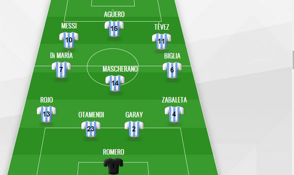 GROUP BΑΡΓΕΝΤΙΝΗΤερματοφύλακες 1. Σέρχιο Ρομέρο (28) Σαμπντόρια 12. Ναουέλ Γκουσμάν (29) Τίγκρες 23. Μαριάνο Αντούχαρ (31) Νάπολι Αμυντικοί 2. Εσεκιέλ Γκαράι (28) Ζενίτ 3. Φακούντο Ρονκάγλια (28) Τζένοα 4. Πάμπλο Σαμπαλέτα (30) Μάντσεστερ Σίτι 13. Μίλτον Κάσκο (27) Νιούελς Ολντ Μπόις 15. Μαρτίν Ντεμιτσέλις (34) Μάντσεστερ Σίτι 16. Μάρκος Ρόχο (25) ManUtd 17. Νικολάς Οταμέντι (27) Βαλένθια Μέσοι 5. Φερνάντο Γκάγκο (29) Μπόκα Τζούνιορς 6. Λούκας Μπίγλια (29) Λάτσιο 7. Άνχελ ντι Μαρία (27) ManUtd 8. Ρομπέρτο Περέιρα (24) Γιουβέντους 14. Χαβιέρ Μαστσεράνο (31) Μπαρτσελόνα 19. Έβερ Μπανέγα (26) Σεβίλλη 20. Έρικ Λαμέλα (23) Τότεναμ 21. Χαβιέρ Παστόρε (25) Παρί Σεν-Ζερμέν Επιθετικοί 9. Γκονσάλο Ιγκουαΐν (27) Νάπολι 10. Λιονέλ Μέσι (27) Μπαρτσελόνα 11. Σέρχιο Αγκουέρο (27) Μάντσεστερ Σίτι 18. Κάρλος Τέβες (31) Γιουβέντους 22. Εσεκιέλ Λαβέτσι (30) Παρί Σεν-Ζερμέν ΠΡΟΠΟΝΗΤΗΣ: Χεράρδο Μαρτίνο (Αργεντινή) |