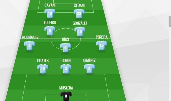 ΟΥΡΟΥΓΟΥΑΗΤερματοφύλακες 1. Φερνάντο Μουσλέρα (28) Γαλατάσαράι 12. Ροντρίγκο Μουνιός (33) Λιμπερτάδ 23. Μαρτίν Σίλβα (32) Βάσκο ντα Γκάμα Αμυντικοί 2. Χοσέ Χιμένες (20) Ατλέτικο Μαδρίτης 3. Ντιέγκο Γκοντίν (29) Ατλέτικο Μαδρίτης 4. Χόρχε Φουσίλε (30) Νασιονάλ 6. Άλβαρο Περέιρα (29) Εστουδιάντες 13. Γκαστόν Σίλβα (21) Τορίνο 16. Μάξι Περέιρα (31) Μπενφίκα 18. Ματίας Κορούχο (29) Ουνιβερσιδάδ ντε Τσίλε 19. Σεμπαστιάν Κοάτες (24) Σάντερλαντ Μέσοι 5. Κάρλος Σάντσες (30) Ρίβερ Πλέιτ 7. Κριστιάν Ροντρίγκες (29) Ατλέτικο Μαδρίτης 10. Χιόρχιαν Ντε Αρασκαέτα (21) Κρουζέιρο 14. Νικολάς Λοδέιρο (26) Μπόκα Τζούνιορς 15. Γκουσμάν Περέιρα (24) Ουνιβερσιδάδ ντε Τσίλε 17. Εχίδιο Αρέβαλο Ρίος (33) Τίγκρες 20. Άλβαρο Γκονσάλες (30) Τορίνο Επιθετικοί 8. Αμπέλ Ερνάντες (24) Χαλ 9. Ντιέγκο Ρολάν (22) Μπορντό 11. Κριστιάν Στουάνι (28) Εσπανιόλ 21. Έντινσον Καβάνι (28) Παρί Σεν-Ζερμέν 22. Χόναταν Ροντρίγκες (21) Μπενφίκα ΠΡΟΠΟΝΗΤΗΣ: Όσκαρ Ταμπάρες (Ουρουγουάη) |
