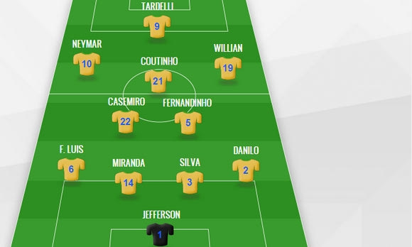 GROUP CΒΡΑΖΙΛΙΑΤερματοφύλακες 1. Ζέφερσον (32) Μποταφόγκο 12. Νέτο (25) Φιορεντίνα 23. Μαρσέλο Γκρόε (28) Γκρέμιο Αμυντικοί 2. Ντάνι Άλβες (32) Μπαρτσελόνα 3. Μιράντα (30) Ατλέτικο Μαδρίτης 4. Νταβίντ Λουίζ (28) Παρί Σεν-Ζερμέν 6. Φιλίπε Λουίς (29) Τσέλσι 13. Μαρκίνιος (21) Παρί Σεν-Ζερμέν 14. Τιάγκο Σίλβα (30) Παρί Σεν-Ζερμέν 15. Ζέφερσον (21) Ιντερνασιονάλ 16. Φαμπίνιο (21) Μονακό Μέσοι 5. Φερναντίνιο (30) Μάντσεστερ Σίτι 7. Ντόουγκλας Κόστα (24) Σαχτάρ 8. Ελίας (30) Κορίνθιανς 11. Ρομπέρτο Φιρμίνο (23) Χόφενχαϊμ 17. Φρεντ (22) Σαχτάρ 18. Έβερτον Ριμπέιρο (26) Αλ-Αχλί 19. Ουίλιαν (26) Τσελσι 21. Φιλίπε Κοουτίνιο (22) Λίβερπουλ 22. Καζεμίρο (23) Πόρτο / Ρεάλ Επιθετικοί 9. Ντιέγκο Ταρντέλι (30) Shandong Luneng Taishan 10. Νεϊμάρ (23) Μπαρτσελόνα 20. Ρομπίνιο (31) Σάντος ΠΡΟΠΟΝΗΤΗΣ: Κάρλος Ντούνγκα (Βραζιλία) |