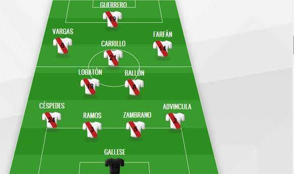 ΠΕΡΟΥΤερματοφύλακες 1. Πέδρο Γκαλέσε (25) Χουάν Άουριτς 12. Ντιέγκο Πένι (31) Σπόρτινγκ Κριστάλ 23. Σαλομόν Λιμπμάν (31) Ουνιβερσιδάδ Σέσαρ Βαγιέχο Αμυντικοί 2. Χαΐρ Σέσπεδες (31) Χουάν Άουριτς 3. Χάνσελ Ριόχας (23) Ουνιβερσιδάδ Σέσαρ Βαγιέχο 4. Πέδρο Πάουλο Ρεκένα (24) Ουνιβερσιδάδ Σέσαρ Βαγιέχο 5. Κάρλος Σαμπράνο (25) Φρανκφούρτη 15. Κριστιάν Ράμος (26) Χουάν Άουριτς 17. Λουίς Αντβίνκουλα (25) Σετούμπαλ 19. Γιοσιμάρ Γιοτούν (25) Μάλμε Μέσοι 6. Χουάν Μανουέλ Βάργκας (31) Φιορεντίνα 7. Πάολο Ουρτάδο (24) Πάσος Φερέιρα 8. Κριστιάν Κουέβα (23) Αλιάνσα Λίμα 13. Έντουιν Ρεταμόσο (33) Ρεάλ Γκαρσιλάσο 16. Κάρλος Λομπατόν (35) Σπόρτινγκ Κριστάλ 20. Χοέλ Σάντσες (25) Ουνιβερσιδάδ Σαν Μαρτίν 21. Γιοσεπμίρ Μπαγιόν (27) Σπόρτινγκ Κριστάλ 22. Κάρλος Άσκουες (23) Μελγκάρ Επιθετικοί 9. Πάολο Γκερέρο (31) Φλαμένγκο 10. Χέφερσον Φαρφάν (30) Σάλκε 11. Γιόρντι Ρέινα (21) Λειψία 14. Κλαούντιο Πισάρο (36) Μπάγερν 18. Αντρέ Καρίγιο (23) Σπόρτινγκ Λισαβόνας ΠΡΟΠΟΝΗΤΗΣ: Ρικάρντο Καρέκα (Αργεντινή) |