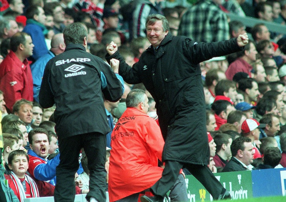 1996-97: Τέταρτο πρωτάθλημα μέσα σε μία πενταετία για την ομάδα του Φέργκιουσον, η οποία άφησε επτά βαθμούς πίσω στη μάχη του τίτλου Άρσεναλ και Νιούκαστλ. Στη φωτογραφία ο Σκωτσέζος τεχνικός πανηγυρίζει μαζί με το συνεργάτη του Μπράιαν Κιντ στο “Άνφιλντ”, με τους “κόκκινους διαβόλους” να παίρνουν σπουδαία νίκη απέναντι στην μεγαλύτερη αντίπαλό τους στο Νησί, με σκορ 3-1 (2 γκολ ο Γκάρι Πάλιστερ και ένα ο Άντι Κόουλ)