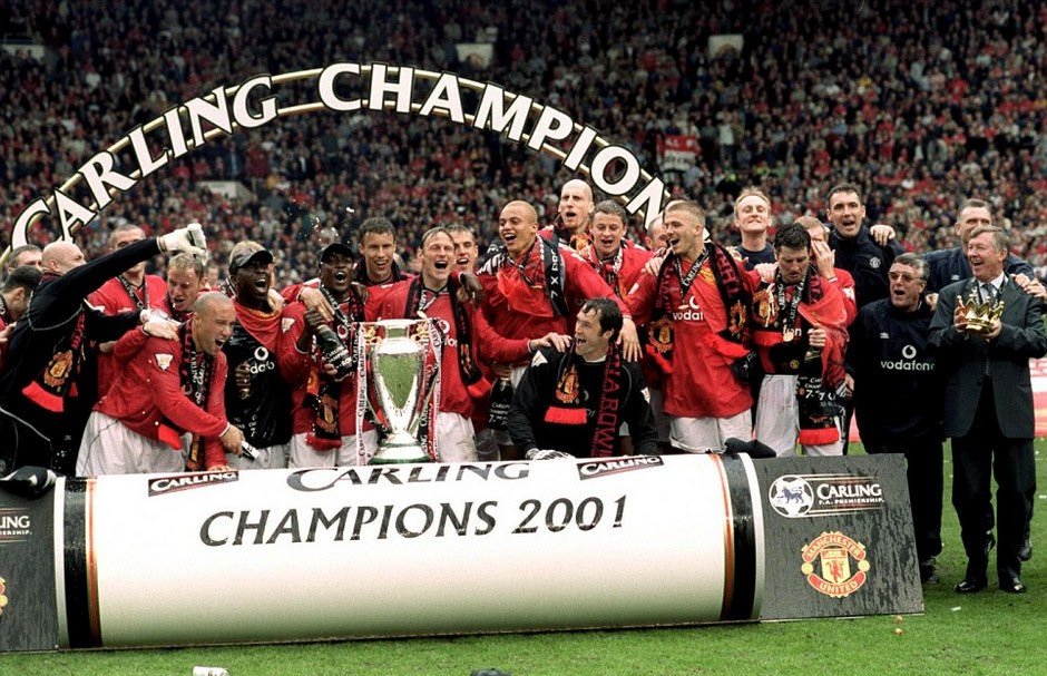 2000-01: Τρίτο συνεχόμενο πρωτάθλημα (για πρώτη φορά στην ιστορία της) για τη Γιουνάιτεντ, η οποιά αν και έχασε τα τρία τελευταία ματς της σεζόν τερμάτισε με 10 πόντους διαφορά από τη δεύτερη Άρσεναλ. Το επιστέγασμα μίας ακόμα εντυπωσιακής σεζόν ήταν φυσικά ο διασυρμός της Άρσεναλ με 6-1 σε αγώνα πρωταθλήματος τον Φεβρουάριο, στον οποίο ο Ντουάιτ Γιορκ είχε σημειώσει χατ-τρικ. Στη φωτογραφία οι παίκτες του Φέργκιουσον πανηγυρίζουν το 7ο πρωτάθλημα του συλλόγου τα εννέα τελευταία χρόνια