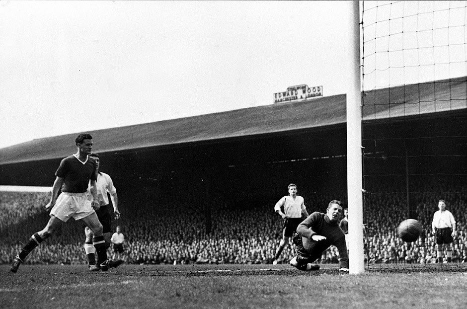 1955-56: Η Γιουνάιτεντ κατακτά το δεύτερο πρωτάθλημα μέσα στη δεκαετία, αφήνοντας 11 πόντους πίσω τις Μπλάκπουλ και Γουλβς. Εκείνη η ομάδα έγινε διάσημη για το επιθετικό της ποδόσφαιρο και έγινε γνωστή με το πέρασμα των χρόνων ως “τα μωρά του Μπάσμπι”. Η φωτογραφία είναι από τη νίκη επί της Τσέλσι με 3-0 στο “Ολντ Τράφορντ”, με τον σκόρερ Τόμι Τέιλορ (τέρμα αριστερά) να τελειώνει τη σεζόν με 25 γκολ απολογισμό