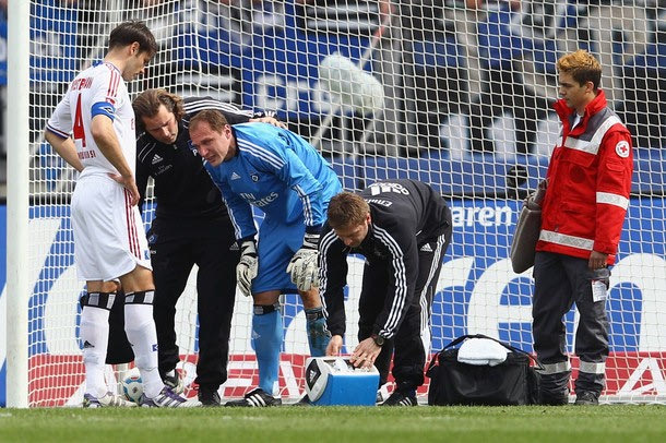 NUREMBERG, GERMANY - APRIL 21: Jaroslav Drobny, keeper of Hamburg receives treatment after getting injured during the Bundesliga match between 1.FC Nuernberg and Hamburger SV at Easy Credit Stadium on April 21, 2012 in Nuremberg, Germany. (Photo by Alexander Hassenstein/Bongarts/Getty Images) Bongarts/Getty Images