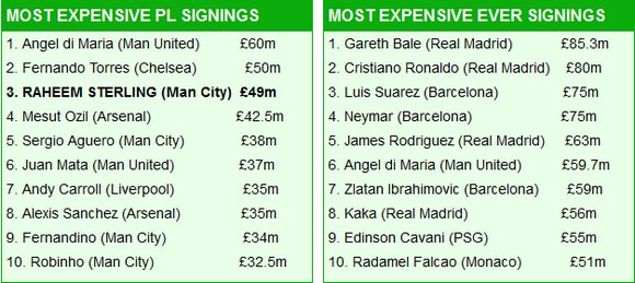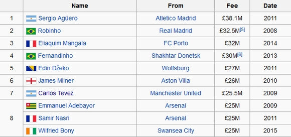 Το top-14 της Μάντσεστερ Σίτι1. Ραχίμ Στέρλινγκ (Λίβερπουλ) [63.340.000€ + 5.630.000€ bonus] 2015 2. Κάρλος Τέβες (Μάντσεστερ Σίτι από MSI) [53.000.000€] 2009 3. Σέρχιο Αγκουέρο (Ατλέτικο) [45.000.000€] 2011 4. Ρομπίνιο (Ρεάλ) [42.500.000€] 2008 5. Ελιακίμ Μανγκαλά (Πόρτο) [40.100.000€] 2014 6. Φερναντίνιο (Σαχτάρ) [40.000.000€] 2013 7. Γιαγιά Τουρέ (Μπαρτσελόνα) [32.800.000€] 2010 8. Ουλφρίντ Μπονί (Σουόνσι) [32.600.000€] 2015 9. Έντιν Τζέκο (Βόλφσμπουργκ) [32.450.000€] 2011 10. Τζέιμς Μίλνερ (Άστον Βίλα) [31.400.000€] 2010 11. Νταβίντ Σίλβα (Βαλένθια) [29.950.000] 2010 12. Μάριο Μπαλοτέλι (Ίντερ) [29.300.000€] 2010 13. Εμανουέλ Αντεμπαγιόρ (Άρσεναλ) [28.950.000€] 2009 14. Σαμίρ Νασρί (Άρσεναλ) [28.400.000€] 2011 |