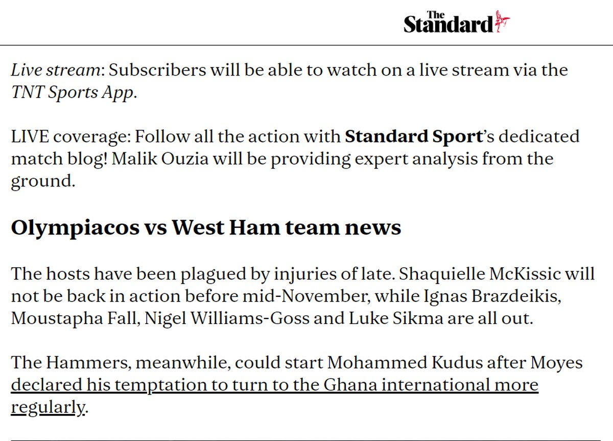 Δύο ημέρες πριν από την αναμέτρηση Ολυμπιακός – Γουέστ Χαμ για την τρίτη αγωνιστική του Europa League (26/10 στις 19:45), αγγλική ιστοσελίδα τα έκανε μαντάρα στο ρεπορτάζ της για τον αγώνα που θα γίνει στο Γεώργιος Καραϊσκάκης.