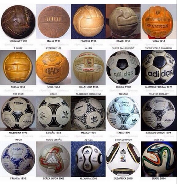 Είκοσι διαφορετικές μπάλες έχουν χρησιμοποιηθεί στην ιστορία του Παγκοσμίου Κυπέλλου (μαζί με αυτή στην Βραζιλία φέτος) και έχει ενδιαφέρον να δούμε μέσω φωτογραφίας την εξέλιξη τους στην πορεία των χρόνων.