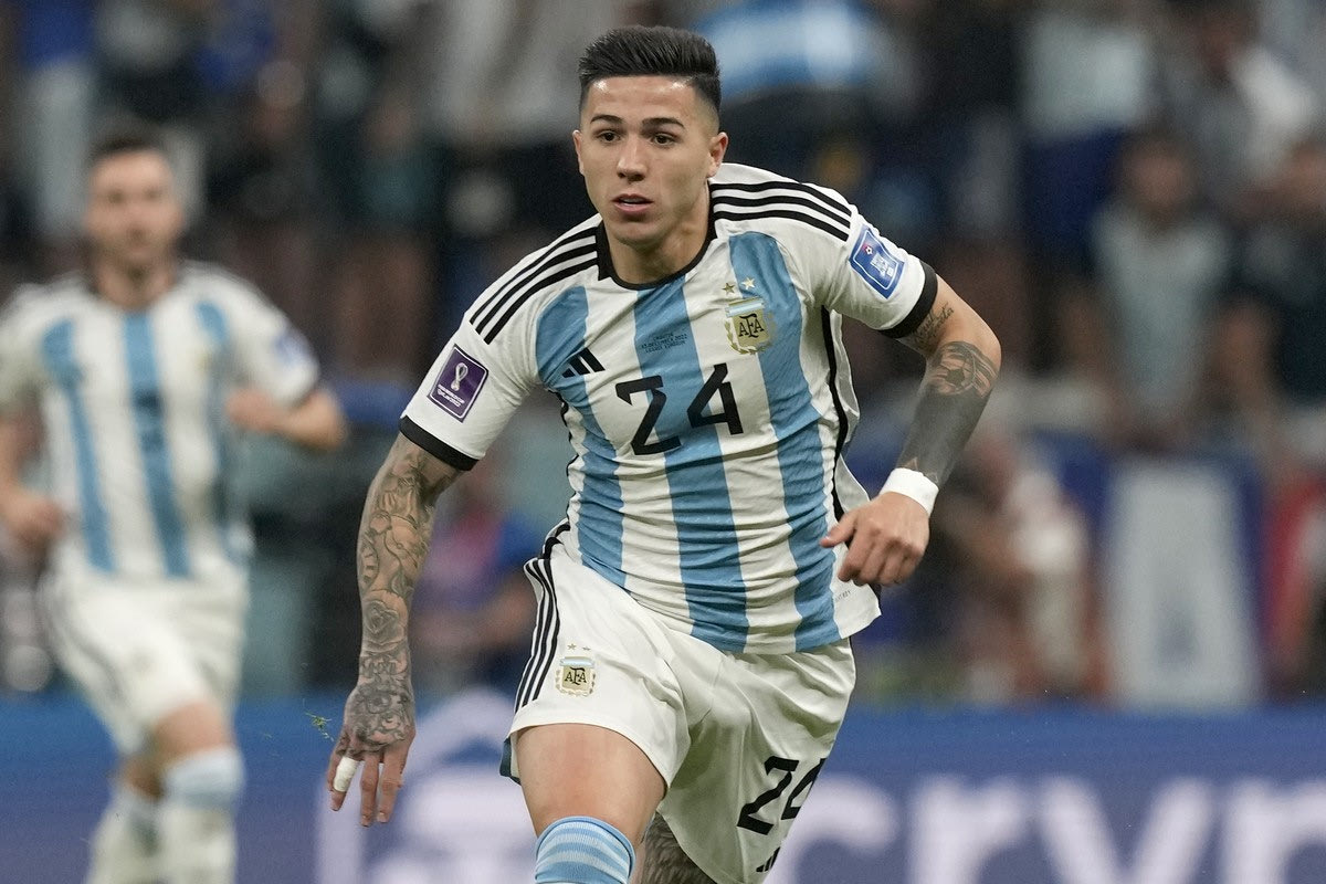 FILE - Argentina's Enzo Fernandez runs with the ball during the World Cup semifinal soccer match between Argentina and Croatia at the Lusail Stadium in Lusail, Qatar, on Dec. 13, 2022. Argentina midfielder Enzo Fernandez became the most expensive player in British soccer history after joining Chelsea from Benfica for 106.7 million pounds ($131.4 million), the Portuguese club announced Wednesday, Feb. 1, 2023. (AP Photo/Frank Augstein, File) AP
