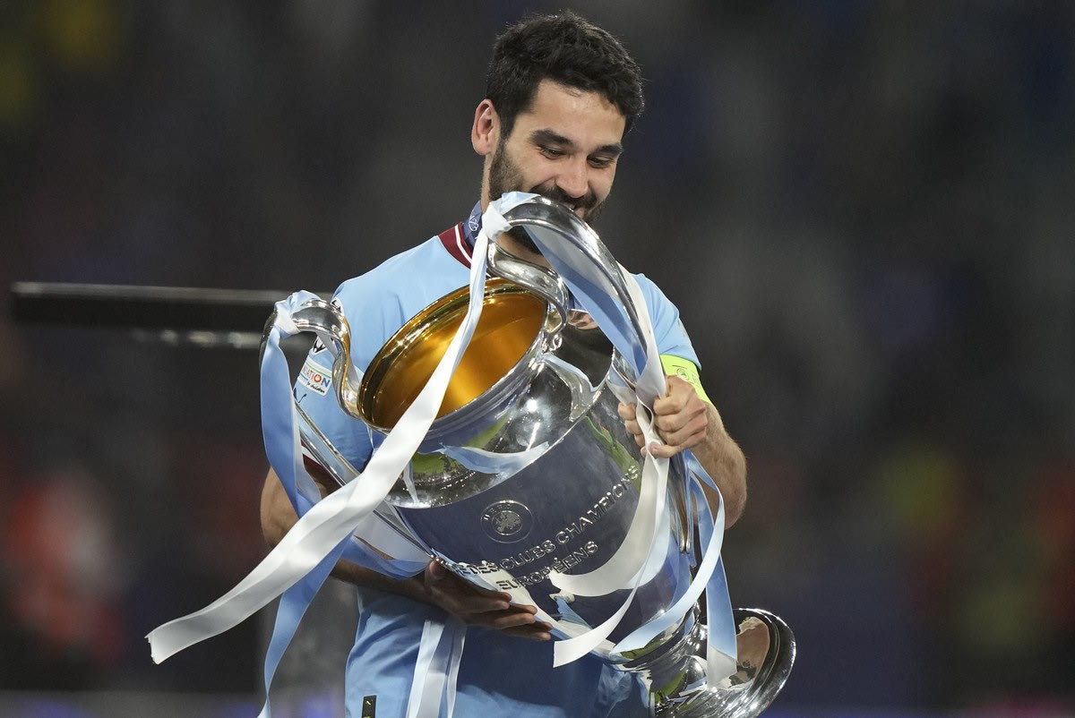 Ο Ιλκάι Γκιντογκάν με το τρόπαιο στην αναμέτρηση της Μάντσεστερ Σίτι με την Ίντερ 2023 AP Photo/Emrah Gurel