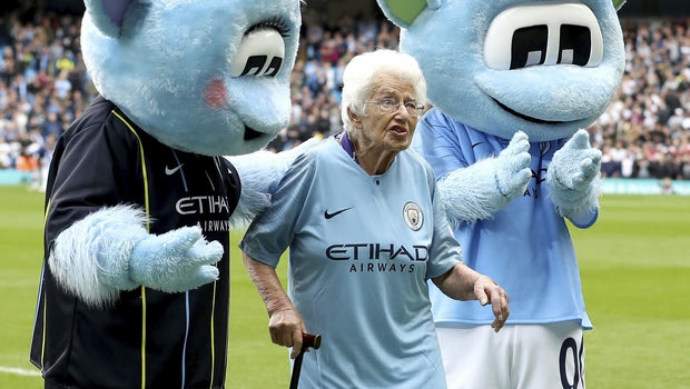 Δύο κυρίες, η Βέρα Κόεν (φωτ.), 102 ετών, και η αδερφή της Όλγα Χάλον, 97 ετών, βγήκαν στον αγωνιστικό χώρο του Etihad μαζί με τους παίκτες της Μάντσεστερ Σίτι για τον αγώνα με τη Φούλαμ. Επρόκειτο για τις δύο μασκότ της ομάδας στο συγκεκριμένο παιχνίδι της Premier League.