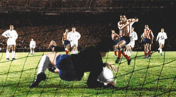 Οι “ροχιμπλάνκος”, πρωταθλητές την προηγούμενη χρονιά, έπαιζαν τον πρώτο ημιτελικό της ιστορίας τους στο Κύπελλο Πρωταθλητριών. Ήταν η τέταρτη διοργάνωση του θεσμού και απέναντί τους βρέθηκε η απόλυτη κυρίαρχος Ρεάλ Μαδρίτης των Πούσκας, Ντι Στέφανο και Χέντο, η οποία είχε κατακτήσει τα τρία πρώτα Κύπελλα. Το πόσο δυσκολεύτηκαν οι “μερένγκες” να πάρουν την πρόκριση, αποδεικνύεται από το ότι χρειάστηκε και τρίτο παιχνίδι για να ξεκαθαρίσουν οι λογαριασμοί. Η πρώτη συνάντηση διεξήχθη στις 23 Απριλίου του 1959 στο “Σαντιάγο Μπερναμπέου” και η Ατλέτι προηγήθηκε νωρίς με τον Τσούθο (13′), αλλά δυο λεπτά αργότερα ο Ρίαλ ισοφάρισε για τη Ρεάλ. Ο Πούσκας με πέναλτι στο 33′ έδωσε προβάδισμα στους γηπεδούχους και λίγο πριν τη λήξη του ημιχρόνου, ο Βραζιλιάνος Βαβά των “ροχιμπλάνκος” δεν κατάφερε να ευστοχήσει από τα 11 μέτρα. Το 2-1 δεν άλλαξε στην επανάληψη και η Ρεάλ πήρε τελικά μια δύσκολη νίκη.
