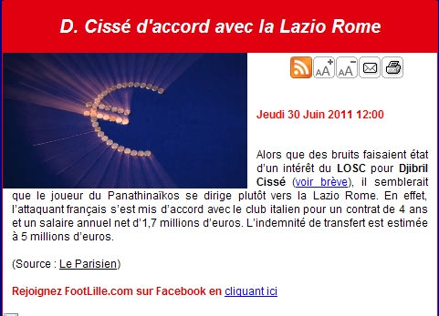 Συγκεκριμένα, η ιστοσελίδα “www.footlille.com” που ασχολείται με το ρεπορτάζ της Λιλ, αναφέρει ότι ο Τζιμπρίλ Σισέ συμφώνησε σε όλα με τους “λατσιάλι”.