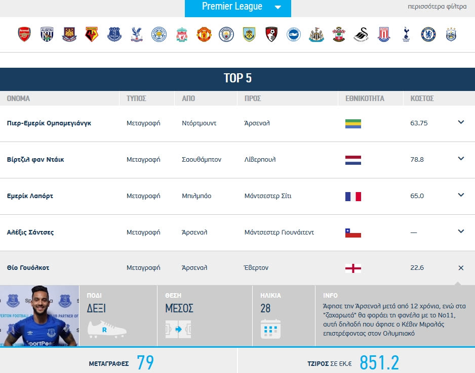 Μπείτε στην πλατφόρμα και κάνοντας κλικ πάνω σε κάθε παίκτη του Top-5 θα δείτε και τα υπόλοιπα στοιχεία της μεταγραφής του, όπως φαίνεται στην παραπάνω photo για τον Γουόλκοτ. Πανώντας κλικ στο σήμα της κάθε ομάδας θα δείτε όλες τις μεταγραφές που έκανε τον Ιανουάριο!