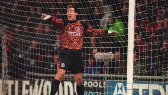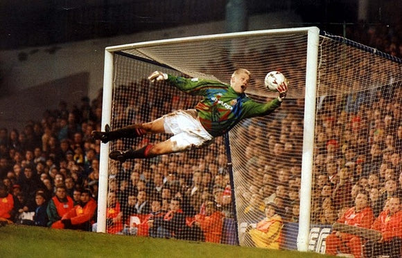 Manchester United goalkeeper Peter Schmeichel is at full stretch to keep out a header from Steve Sedgley.