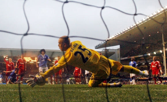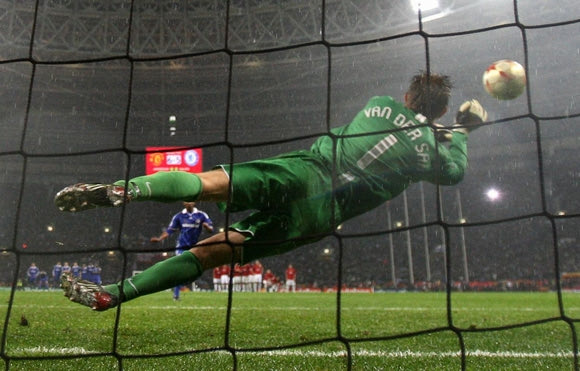 Manchester United's Dutch goalkeeper Edwin van der Sar saves a penalty by Chelsea's French forward Nicolas Anelka to win the final of the UEFA Champions League football match at the Luzhniki stadium in Moscow on May 21, 2008. The match remained at a 1-1 draw and Manchester won on penalties. AFP PHOTO / Franck Fife (Photo credit should read FRANCK FIFE/AFP/Getty Images)