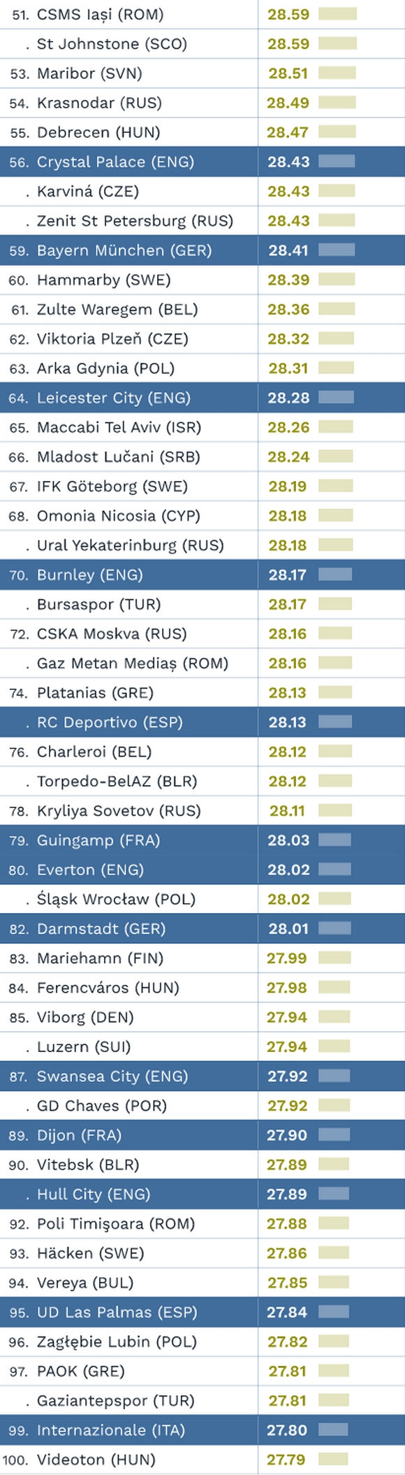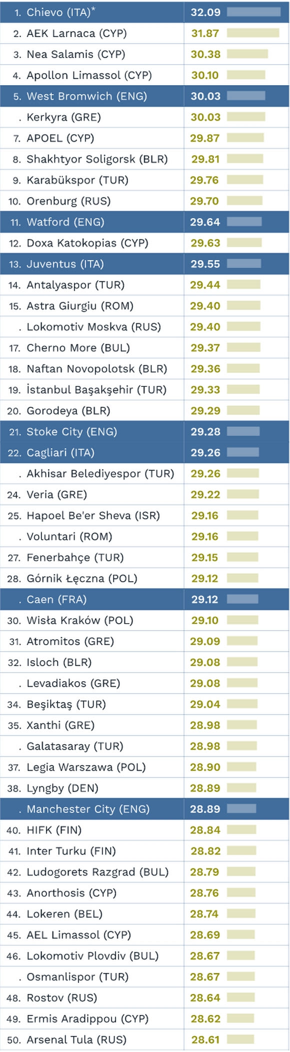 Μάλιστα, μετά από την Κέρκυρα υπάρχει ο ΑΠΟΕΛ με 29,87, με την Κύπρο (9 ομάδες) να είναι η τρίτη χώρα με τους πιο πολλούς εκπροσώπους στο top 100 μετά από την Αγγλία και την Τουρκία (10 ομάδες) και μαζί με τη Ρωσία.