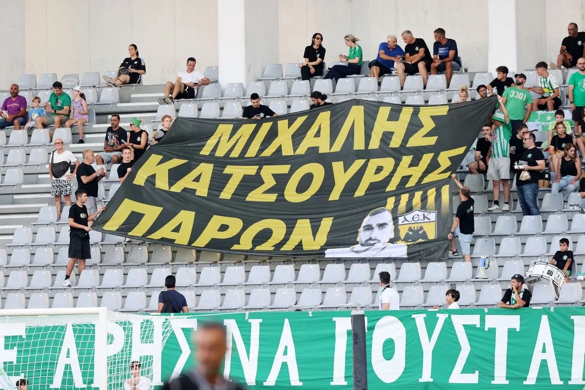 Μάλιστα, αναρτήθηκε έπειτα ένα σχετικό πανό στην εξέδρα των γηπεδούχων, το οποίο έγραφε: “Μιχάλης Κατσούρης, Παρών”.