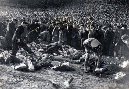 Μέρος της κερκίδας υποχωρεί στον αγώνα για το κύπελλο Αγγλίας καθώς είχαν στοιβαχτεί σε αυτή υπεράριθμοι θεατές. Κάποιο θεατές σκοτώθηκαν από την κατάρρευση, άλλοι ποδοπατήθηκαν στην προσπάθειά τους να απομακρυνθούν από το σημείο.