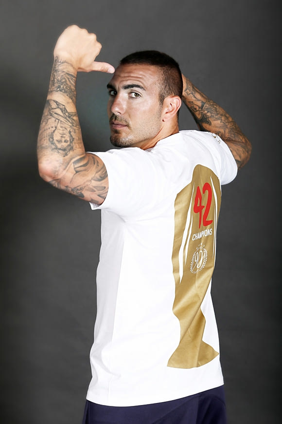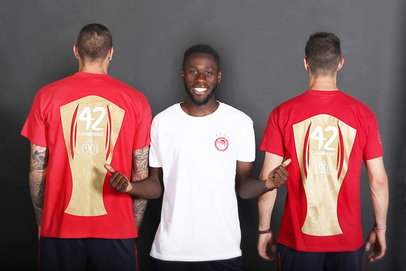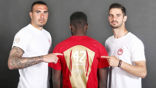 Τρεις παίκτες του Ολυμπιακού φωτογραφήθηκαν με τα t-shirts του 42ου πρωταθλήματος, τα οποία έχουν γίνει ανάρπαστα. Οι Ρομπέρτο, Μαζουακού και Αυλωνίτης ανέλαβαν ρόλο… μοντέλου.