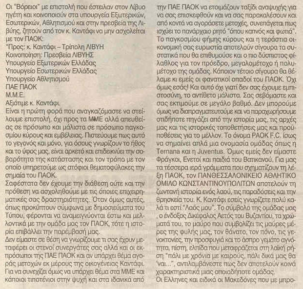 Τρομερή ιστορία. Οι φήμες ήθελαν τον γιο του Μουαμάρ Καντάφι να ενδιαφέρεται για το 20% της ΠΑΕ ΠΑΟΚ! Μάλιστα συνέδεαν την όλη ιστορία με την παρουσία του γιου καντάφι στην Γιουβέντους. Οπαδοί της ομάδας έστειλαν επιστολή στον Λίβυο ηγέτη με σκοπό να εμπλακεί στα διοικητικά του συλλόγου!