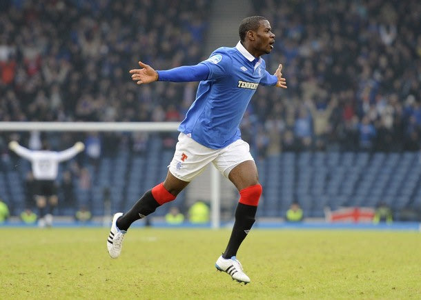 Rangers' Maurice Edu celebrates his goal against Motherwell during their Scottish League Cup semi final soccer match at Hampden Park in Glasgow, January 30, 2011. REUTERS/Russell Cheyne (BRITAIN - Tags: SPORT SOCCER)